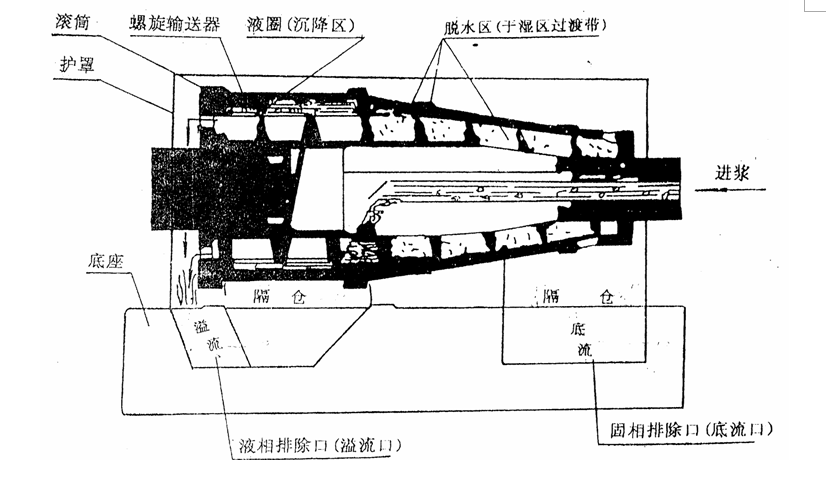 一、工作流程:離心機工作時,鉆井液通過一根插入螺旋輸送器空心軸內的進液管進入離心機,首選在離心機內被加速,然后經空心軸上的噴液孔再進入高速旋轉的轉鼓內,在離心力的作用下,由于離心機作用,產生離心力,位于液圈的外層,緊貼于轉鼓內壁形成固相層,液圈的內層最主要是液相和懸浮的膠體粘土。螺旋輸送器的刮板將貼于內壁上的固相層,刮下來推向轉鼓脫水區。在脫水區有如洗衣機的甩干筒一樣濕淋淋的固相顆粒受到離心擠壓和離心脫水的作用,擠出所有的自由水,然后被螺旋輸送器推到轉鼓小端的底流嘴排出機體外。液圈內層的液相和懸浮的超細顆粒由推進器刮向轉鼓大端,由大端上的幾個滴流孔排出機體外。返回到泥漿循環系統。